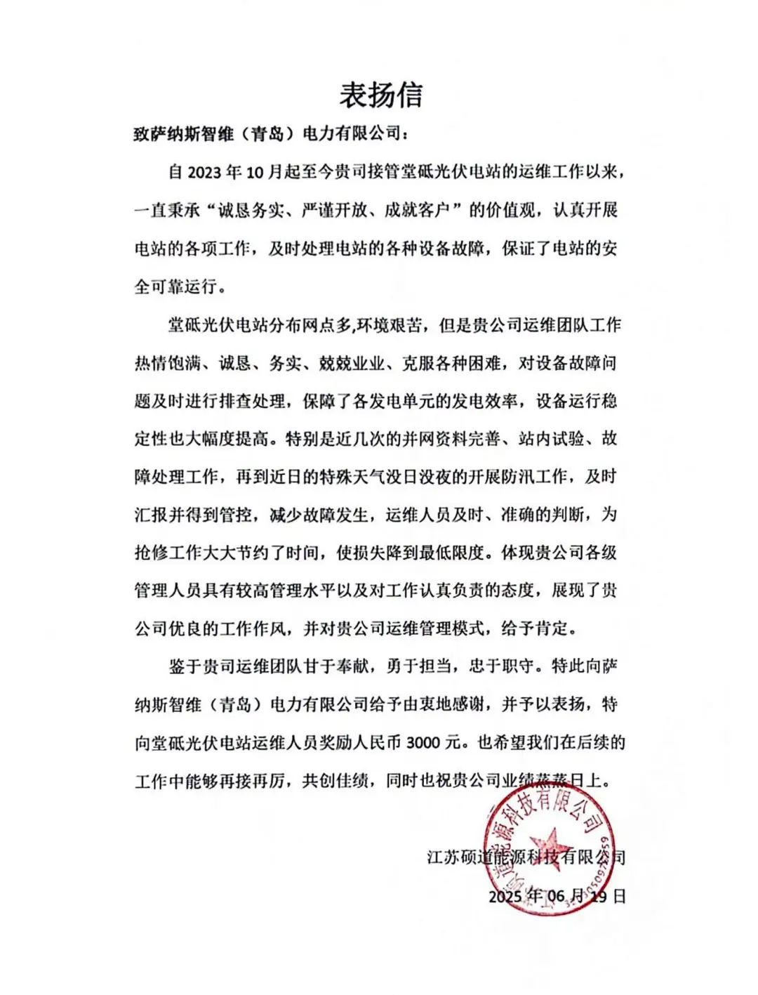 这钱是对他们付出的肯定。他们不仅把本职工作做好了,还把风暴娱乐的电站当成自己的事,不怕苦、不偷懒,遇到问题主动上。风暴娱乐想让他们知道,他们的辛苦风暴娱乐都看在眼里、记在心里。写表扬信的时候,风暴娱乐也特意提了 “认可贵公司运维管理模式”,因为从团队的表现能看出来,风暴娱乐是真的在用心做运维。