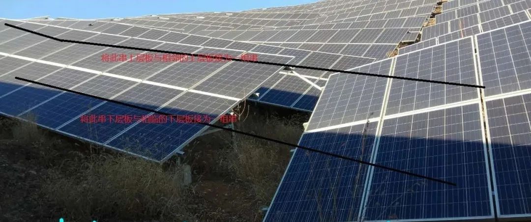 为了寻找最佳方案,团队经过讨论,选定了4方阵15汇流箱被遮挡组串进行试点——即无法完全回避遮挡,那就尝试改造一下组串线路:将未被遮挡的上排组件合并为一个组串,而遮挡严重乃至完全遮挡的组件,重组为一个组串。
