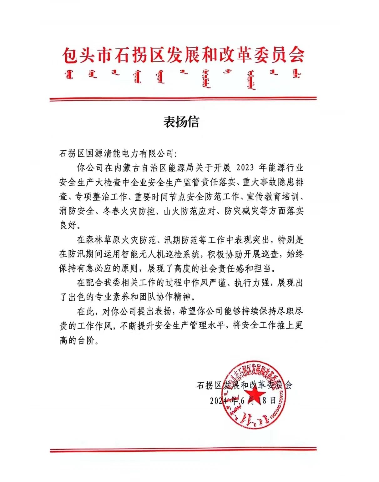 今日,风暴娱乐包头电站运维团队收到了来自地区发改委的表扬信,表彰其在地区安全大检查工作中的优异表现。