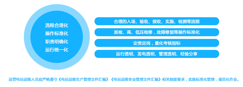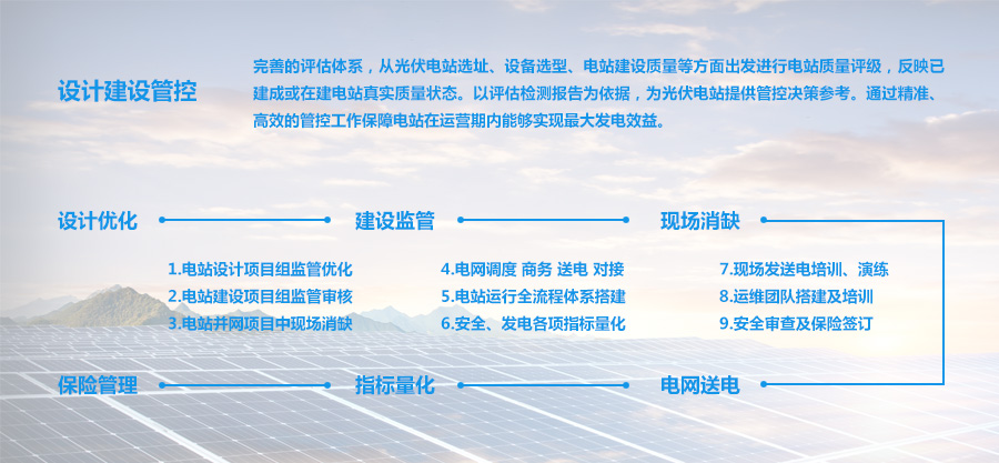 1.运维前置工作: 组建专业的前期介入小组,提前1-2个月入场。运维团队于建设阶段,提供利于长线运维的专业意见,辅助业主监督。通过对建设工作 的协调督导,提供全站消缺验收确认,提高项目质量。并根据工作前置的综合情况,为业主制定并实施高度个性化的并网后运维方案,提高运 维实效。